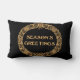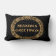 Un Coussin Lumbar festif ou Cushion avec une couronne de Noël de saint, lierre, poinsettias, cônes de sapin et sprigs de sapin, Cette couronne de Noël dessinée à la main est en effet doré sur un arrière - plan noir, avec des "Bonnes Fêtes en lettrage décoratif, également en effet or.