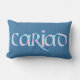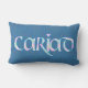 Un coussin lombaire d'amusement avec le mot de Gallois "cariad" dans un manuscrit celtique, rempli de motif assez floral décrit dans le bleu lumineux sur un arrière - plan bleu profond. Cadeau parfait pour celui que vous aimez !