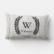 Les orignaux détaillés que le croquis sur un blanc a lavé les planches en bois impriment sur la face frontale du coussin. Le postérieur du coussin comporte un cadre noir de guirlande de lauriers contenant votre choix de lettre et de nom de famille personnalisés de monogramme en texte noir.