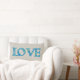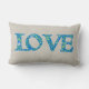 Un coussin lumbar amusant avec le mot LOVE dans des lettres remplies d'un joli motif floral bleu et vert sur un arrière - plan de couleur hessienne (burlap).