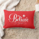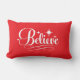This holiday throw pillow is shown with a Believe print in a fancy script.