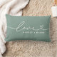 Moderne et élégant design lombaire sur mesure avec oreiller conception simple et minimaliste de la typographie "Amour" qui comprend des détails florissants et de coeur. Personnalisez le texte majuscule ci-dessous avec un monogramme pour un couple ou une famille, un devis ou un autre texte préféré. Les couleurs gris vert et blanc peuvent être modifiées.