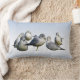 Cet oreiller décoratif à jetons présente six mouettes grises et blanches rassemblées au bord de l'eau par beau temps. L'image est répétée à l'arrière.