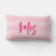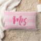 Coussin avec "Mme" en pinceau rose contre un arrière - plan motif à rayures roses. Idéal pour les mariages ou anniversaires.