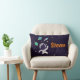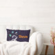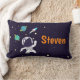 Un coussin lombaire personnalisé avec un arrière - plan bleu foncé aux étoiles jaunes éparpillé un peu partout. Couché sur le dessus est l'illustration d'un astronaute vêtu d'une combinaison blanche flottant dans l'espace. Au loin, il y a des planètes avec des anneaux et un vaisseau-fusée qui explose vers des endroits inconnus.