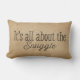 Regard vintage avec le coussin de style de toile de jute "elle tout au sujet du câlin" est imprimée sur l'avant. Ajoutez n'importe quel nom ou l'expression au de nouveau à personnalisent.
