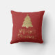 Un Coussin brillant avec un arbre de Noël Faux Gold Foil sur un arrière - plan rouge avec une joyeuse typographie "Joyeux Noël". Une belle et élégante façon de décorer notre maison avec un joyeux thème de vacances.