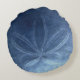 Un coussin rond bleu de denim modelé avec un dollar de sable.