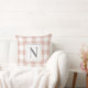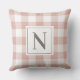 Un oreiller à jetons de style ferme neutre est doté d'un motif classique, moderne, traditionnel rose rose et blanc en vichy chèque plaid avec un monogramme de famille personnalisé, modèle de lettre initiale qui peut être personnalisé de part et d'autre du coussin. Notez que le texte gris fusain et la couleur arrière - plan rose rose peuvent être customisés pour correspondre à votre décor maison.
