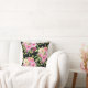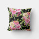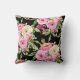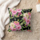 Des roses d'aquarelle luxuriants dans les tons rose, rouge, pêche et crème fleurissent sur un arrière - plan noir sur cet oreiller féminin.