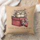 This Love You Fur-Ever throw pillow showcases a sweet sleeping kitten nestled inside a gift box on a warm beige background. The deeper neutral tone adds a cozy, comforting feel while beautifully complementing the soft reds and gentle illustration style. Designed for cat lovers who appreciate calm, inviting interiors, this pillow blends effortlessly into modern, boho, or cozy home decor.