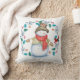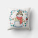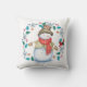 Ce mignon coussin de Jour de Fêtes a un bonhomme de neige heureux tout habillé dans son chapeau haut, foulard d'hiver, veste et mitaines. Avec un grand sourire sur le visage, il regarde un petit oiseau cardinal rouge qui est perché dans une feuille bleue et une couronne de baies rouges. Les images sont placées sur un arrière - plan blanc de neige. Les deux côtés du coussin ont la même image.
