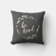 Un oreiller design et minimaliste avec la citation de gentillesse inspirante - Be Kind - en belle écriture manuscrite à l'intérieur d'une couronne florale moderne en crème sur un arrière - plan noir.