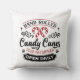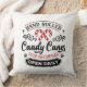 Ce coussin de style ferme est décoré d'un logo qui dit "Sucres de canne roulés à la main". Les couleurs sont rouge et noir.