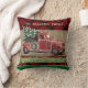 Ce coussin orienté de vacances comporte un camion vintage rouge transportant un arbre de Noël. L'arrière - plan a une texture de toile de jute de faux et un plaid rouge et noir derrière. Personnalisez le nom de famille avec vos propres ou pour donner comme cadeau. Conçu par le © Tim Coffey d'artiste.