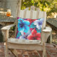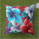A Colorful Outdoor Patio Pillow Designed With A Tropical Hibiscus Red, Blue, And Purple Flower