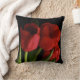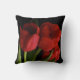 Ce somptueux oreiller à jetons présente un bouquet de tulipes rouge écarlate et de feuilles verts posés sur un pur arrière - plan noir. L'image est répétée à l'arrière.