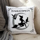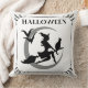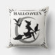 Célébrez l'Halloween dans le style avec cet oreiller magique à lancer avec typographie décorative, la silhouette d'une sorcière merveilleusement méchante volant un balai avec son chat noir avec un croissant de lune et des chauves-souris dans l'arrière - plan. lettrage. Comprend un défilement et une bordure en étoile sur un arrière - plan blanc.