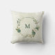 Magnifique coussin de lancer romantique avec des fleurs vert sauge et blanches et quelques jolies feuilles.