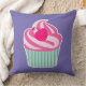 Art graphique / illustration d'un cupcake rose délicieux avec des tourbillons de glaçage sur le dessus et une jolie cerise à pois rose chaud. La base est à rayures vertes et blanches. Arrière - plan violet clair.