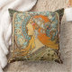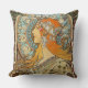 Un oreiller à lancer avec la lithographie, Zodiac (1896) par Alphonse Mucha, illustrateur et peintre d'origine tchèque. Portrait d'une femme avec des bijoux dans les cheveux assis devant un tableau de zodiac.