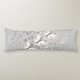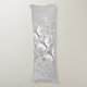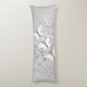 Coussin avec ma conception de papillons blancs et noirs volant au-dessus de bulles aérées de gris et blanc avec des touches de pêche, sur un arrière - plan gris.