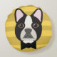 Bleu et noir, rond. Se glisse dernière le dos pour le soutenir. La qualité d'impression est excellente.