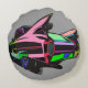 Bleu et noir, rond. Se glisse dernière le dos pour le soutenir. La qualité d'impression est excellente.