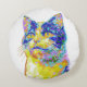 Bleu et noir, rond. Se glisse dernière le dos pour le soutenir. La qualité d'impression est excellente.