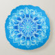 Coussin rond dans un mandala texturé batik / motif médaillon dans les tons aqua, turquoise et bleu cobalt sur un arrière - plan turquoise