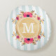 Coussin ronde avec motif rayé à la menthe, fleurs roses aquarelles et faux feuille d'or monogramme personnalisé.