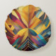 Au centre, convergent un ensemble dynamique de formes géométriques et audacieuses, formant une composition symétrique et colorée. La pièce utilise une variété de teintes, allant des jaunes chauds et des oranges aux bleus et violets cool.