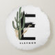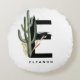 Coussin rond E monogramme personnalisable avec cactus aquarelle, feuilles faux feuille d'or et accents de brosse d'aquarelle noire. Personnalisez ce coussin de monogramme tropical en ajoutant votre nom ou d'autres détails. Ce coussin monogrammé E boho lettre sera parfait comme cadeau. D'autres lettres sont disponibles.