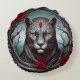 Illustration frappante d'une panthère, encadrée dans un dessin circulaire entrelacé de branches et de roses rouges. Le front de la panthère est marqué d'un symbole rouge semblable à un bijou, ajoutant un élément de mystique. L'esthétique générale allie éléments naturels et sens de l'imaginaire et du symbolisme.