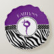 Coussin rond de zèbre de gymnastique sauvage d'impression dans le pourpre. Une silhouette de gymnaste pose à l'intérieur d'un cercle et il y a une bannière "à pois" pour le contraste. Ajoutez votre propre nom avant la commande ! En plus, employez la "personnaliser il" bouton pour plus d'options, y compris une police différente !