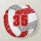 Ce coussin rond à thème girly volleyball présente l'image réaliste d'un volleyball rouge, gris et blanc qui a un motif de fleurs de doodle, plumes et paislies en blanc couvrant les panneaux rouges et gris du volleyball - personnalisez avec le nom de l'athlète et le monogramme ou la variété sur le devant et le numéro jersey sur le dos - par katz_d_zynes