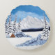 A round pillow with a beautiful winter scene including snowy mountains, rustic cabin and snow covered evergreens. The images and text can be personalized. Original artwork by W.B.