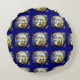 Bleu et noir, rond. Se glisse dernière le dos pour le soutenir. La qualité d'impression est excellente.