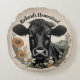 Une adorable ferme au printemps avec une vache noire et des fleurs.