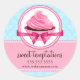 © 2012 Socialite Designs. Our couture cupcake bakery box seals / stickers have an elegant cupcake with ribbon and bow, flowers and swirls inside a lace circle. The background has a subtle damask pattern.