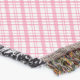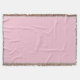 A decorative pink throw blanket with a subtle geometric pattern and fringed edges is displayed in two orientations: horizontally and vertically.