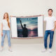 Cette image représente la silhouette d'un homme debout dans l'eau peu profonde avec son bras levé vers le ciel. L'arrière - plan présente un coucher de soleil serein, avec à l'horizon des teintes rose, orange et bleu profond. L'eau calme reflète les couleurs du ciel, créant une atmosphère tranquille et onirique.