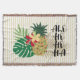 Célébrez les fêtes avec cet ananas décoré de façon festive avec des fleurs d'hibiscus et de feuilles tropicaux et le salut fantaisiste ALO-HO-HA. Ce design a une bande à cocher dans l'arrière - plan. Cette conception est coordonnée avec un imprimé Aloha en allover sur un terrain à bandes.