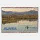 Seul dans le désert. Un canot surplombe l'eau glacée du lac à l'intérieur de l'Alaska. Au loin la taïga typique et les montagnes. Le texte "Alaska" apparaît également. Cette image provient d'une photographie du United States Fish and Wildlife Service.