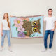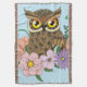 Jolie petite chouette brune assise au milieu des pêches pastel, rose et violet fleurs de printemps dans un décor bleu clair