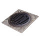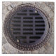 Comporte une grille antique de couverture de trou d'homme nichée dans une vieille route de pavé rond. Rustique et raffiné avec le charme de Vieux Monde.