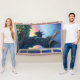 Gargoyle Guardian Art de Traci Van Wagoner imprime, affiche, accessoires et cadeaux une gargouille en pierre bleue et grise qui vous regarde de sa perche au-dessus de la ville tôt le matin avec un ciel de soleil levant texturé de jaune, orange, rose, violet et bleu. Obtenez-vous un gardien de gargoyle aujourd'hui pour garder une attention pour vous.