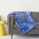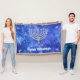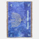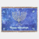 Une menorah Hanoukka et "Happy Hanoukka" en or brillant, en bleu et blanc, superposées sur une image fractale bleue et blanche qui rappelle les flocons de neige dans une tempête. Chag Sameach !