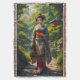 Maiden of the Green Garden - (Midori no Sono no Otome) - Cette oeuvre représente une femme solitaire en tenue japonaise traditionnelle, un kimono, marchant le long d'un chemin sinueux en pierre dans un jardin luxuriant. Sa robe est composée d'un mélange de vert tendre, de gris muet et de rouge profond, avec des motifs floraux subtils. Elle porte un petit panier tressé rempli de ce qui semble être des fleurs rouges.