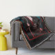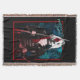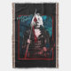 Harley Quinn debout devant des fougères vertes dans une frontière rouge.